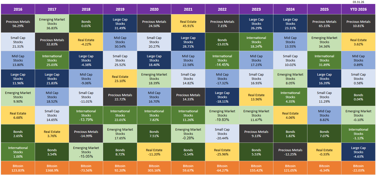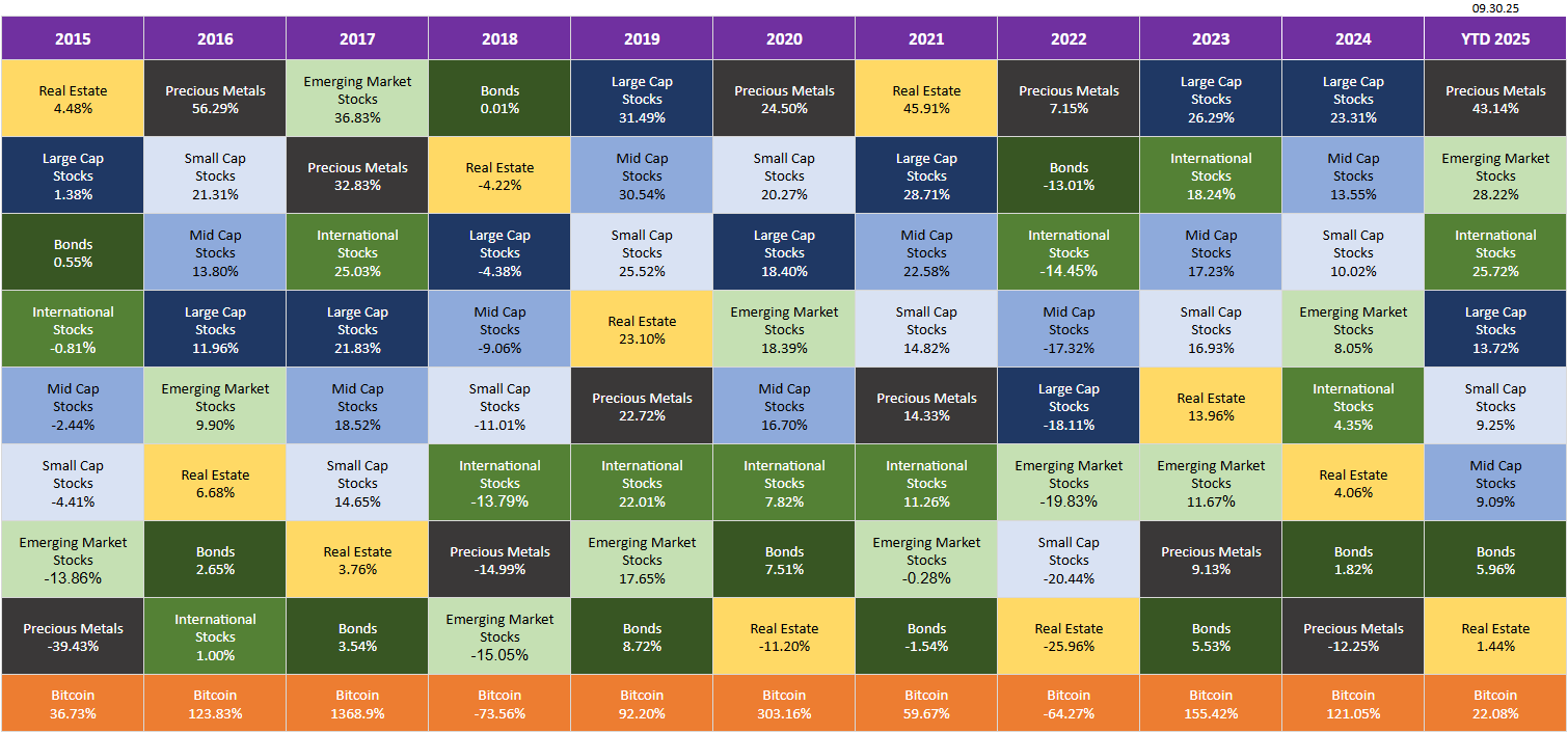 This table illustrates the returns of various indices to demonstrate the importance of owning a diversified portfolio. Diversification does not assure a profit nor does it protect against loss of principal. The returns include dividend reinvestments but exclude the impact of management fees and trading costs. Past performance is no assurance of future performance.